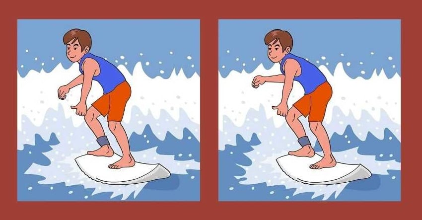 Na zdjęciu widzimy surfera, który podbija fale na desce surfingowej. Na pierwszy rzut oka może się wydawać, że faceci na obu zdjęciach są tacy sami, ale jeśli przyjrzeć się bliżej, staje się jasne, że tak nie jest – gdzieś jest kilka różnic, które sprawiają, że zdjęcia są różne.