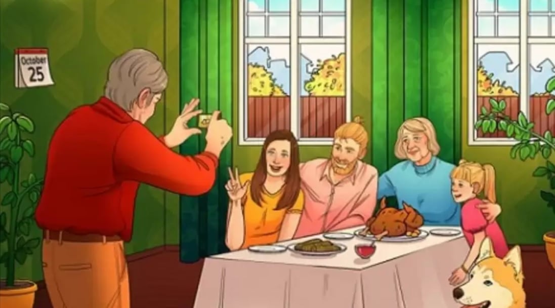 Datą w kalendarzu powinien być 22 października. Zdjęcie przedstawia rodzinę obchodzącą Święto Dziękczynienia, na co wskazuje pieczony indyk – tradycyjne danie tego święta. W Ukrainie Święto Dziękczynienia przypada 22 października.