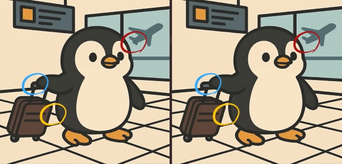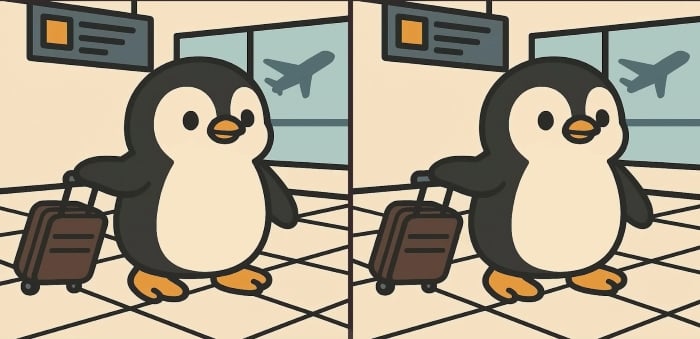 Czy jesteś gotowy na kolejne wyzwanie? Przyjrzyj się uważnie dwóm zdjęciom uroczego pingwina niosącego bagaż na lotnisku. Na pierwszy rzut oka mogą wyglądać identycznie, ale kryją się na nich 3 małe różnice. Myślisz, że znajdziesz je wszystkie w 61 sekund? Spróbuj i sprawdź swoją ostrość widzenia!