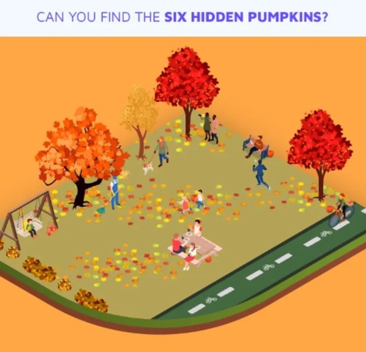 Musisz znaleźć 6 dyń, masz 10 sekund na rozwiązanie zadania. Przyjrzyj się uważnie drzewom i ludziom na placu zabaw.