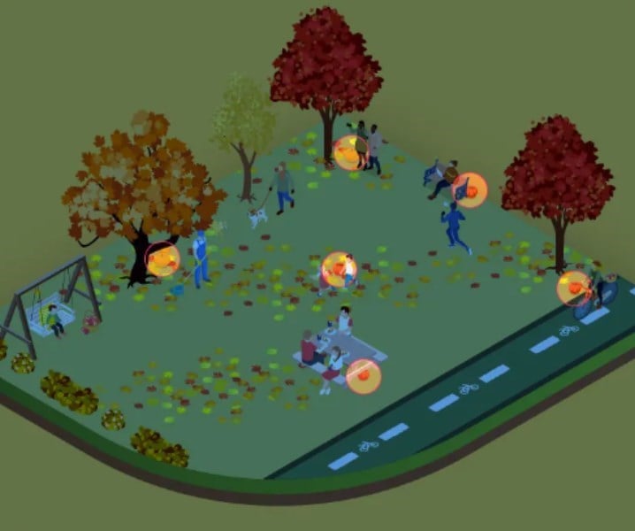 Zdjęcie przedstawia jesienny plac zabaw, po którym spacerują ludzie i dzieci. Wszyscy są zajęci swoimi sprawami, ale obok niektórych z nich znajdują się dynie, których szukamy.